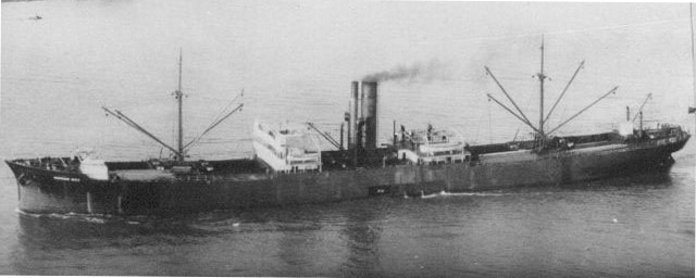 The condition of the wreck had not changed significantly by the following January. The colonial village across the main lagoon passage was in dire straits, cut off from resupply by the war. This photo was taken from a USAAF C-47 making a humanitarian airdrop of food to the British colony.