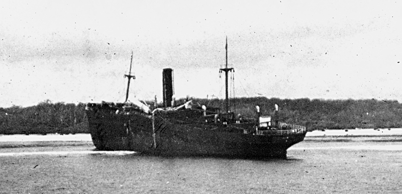 Six years on the reef. Taken from the Royal Navy cruiser HMS Wellington when it mapped the island’s perimeter in 1935, this photo shows that roughly half of Norwich City’s hull rode up onto the reef in the grounding. The stern, from the white line of surf aft, is hanging off the reef edge and has begun to settle from the stress.