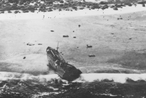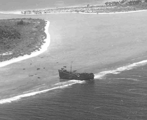 Twelve years on the reef. This aerial photo, taken from a U.S. Navy PBY in June 1941, shows that large pieces of wreckage have been driven in a southeasterly direction across the reef and many smaller bits of debris have been pushed up onto the beach.