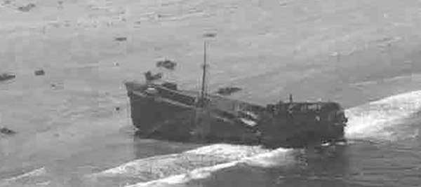 Twenty-four years on the reef. There are no known images of the wreck after 1942 until an aerial mapping survey of the island in 1953. In this photo the hull from amidships forward appears to be intact.