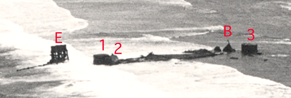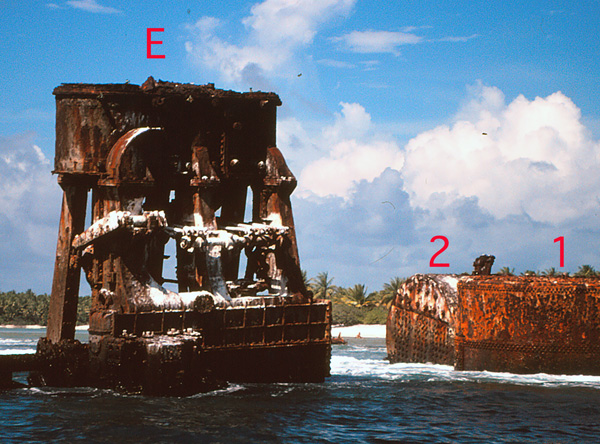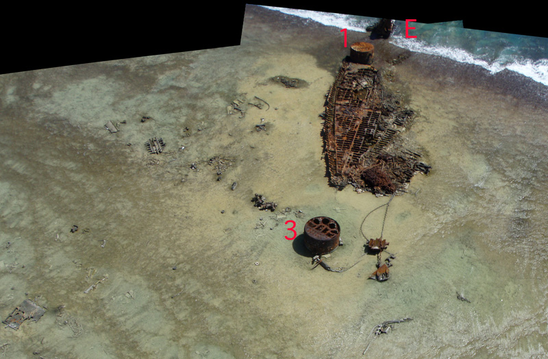 Fifty-nine years on the reef. This aerial photo was taken by the Royal New Zealand Air Force. With the hull plating gone, several prominent internal features of the ship have been exposed. The triple-expansion steam engine (E), a large storage tank (1), the boiler (2), the remains of the bow (B), and another large tank (3).