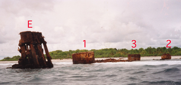 Sixty years on the reef. When TIGHAR visited the island for the first time the wreck was relatively unchanged from 1988. The white surfaces are bird droppings. Engine (E), boiler (2), and tank (1).