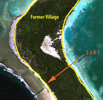 When TIGHAR returned to the island in 1991, the beach exhibited severe storm damage. Artifact 2-2-V-1 was discovered among the washed-up beachfront vegetation near the collapsed seaward-facing wall of the store.