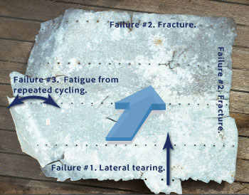 The edges of the sheet exhibit three types of failures. One long edge failed from lateral tearing; the other long edge and one short edge fractured due to the impact of a powerful fluid force on the interior surface of the sheet; the remaining short edge failed from fatigue after repeated cycling. The failures did not occur simultaneously in a single event. The artifact appears to be a piece of debris from an aircraft that was destroyed in a series of high-energy events over some period of time – perhaps minutes, perhaps hours, perhaps days.