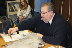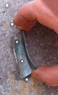 Careful measurement of the space between lines of rivets holes revealed that the lines do not taper or converge as previously believed – including by the National Transportation Safety Board (NTSB) Lab. There are, however, slight irregularities in the spacing between lines suggesting that the underlying structures, presumably stringers, were not precisely aligned. These irregularities suggest that 2-2-V-1 may be part of a repair.Aris Scarla uses dividers to check span between lines of rivet holes on Artifact 2-2-V-1. Photo courtesy W. Mangus.- The missing rivets in 2-2-V-1 were not drilled out. The rivet holes exhibit none of the distortion that inevitably results from drilling. This again suggests that the holes were made either during original construction or during factory repair, not wartime field repair.