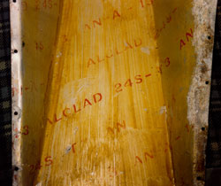 During the Commission’s visit, the NMUSAF staff pointed out examples of original labeling on aluminum from aircraft under restoration. Labeling on original aluminum from B-17F “Memphis Belle” included the word ALCLAD, but in smaller size and a somewhat different style than the AD on 2-2-V-1. No example of AN-A-13 labeling was found.