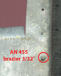 The single surviving rivet is an AN455-AD “brazier head” rivet with a shaft diameter of 3/32″ (colloquially a “#3” size rivet). The “brazier head” has a low profile and was used on external surfaces to reduce aerodynamic drag.