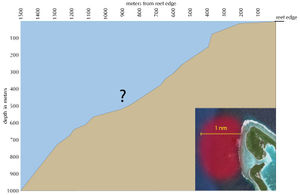 :On the lee side, the reef typically descends rather gently to a depth of about 12 meters, then becomes increasingly steep to about 40 meters, and then drops precipitously into the depths. Particularly off the northwest side of the island around [[Tatiman Passage]] there are arroyo-like features three or four meters deep and a meter or two wide, which the divers thought could easily catch and hold aircraft parts falling down from the reef flat, though none were noted. A shelf was noted at about 10-12 meters deep along the lee side, extending for some distance to the northwest from the vicinity of the ''[[Norwich City]]'' wreck. On the windward side the pitch of the reef is somewhat less precipitous and the reef is cut by "spur and groove" features--high energy channels radiating out from the island, generally quite straight, and one to two meters wide. The windward side also features a number of crater-like features that trap sand and could easily trap airplane wreckage were there any to be trapped. The reef on this side is also undercut at some points. | :On the lee side, the reef typically descends rather gently to a depth of about 12 meters, then becomes increasingly steep to about 40 meters, and then drops precipitously into the depths. Particularly off the northwest side of the island around [[Tatiman Passage]] there are arroyo-like features three or four meters deep and a meter or two wide, which the divers thought could easily catch and hold aircraft parts falling down from the reef flat, though none were noted. A shelf was noted at about 10-12 meters deep along the lee side, extending for some distance to the northwest from the vicinity of the ''[[Norwich City]]'' wreck. On the windward side the pitch of the reef is somewhat less precipitous and the reef is cut by "spur and groove" features--high energy channels radiating out from the island, generally quite straight, and one to two meters wide. The windward side also features a number of crater-like features that trap sand and could easily trap airplane wreckage were there any to be trapped. The reef on this side is also undercut at some points. | ||