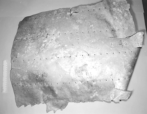 A piece of Alclad aluminum known to have been used to repair aircraft. | A piece of Alclad aluminum known to have been used to repair aircraft. | ||
