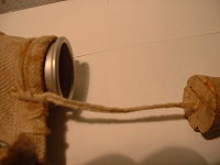 With reference to the last two photos: "This water bag's mouth looked like aluminum (to me) and the threaded cap was attached with a string (no chain). The top of the water bag was closed with a flat steel sheet plus unusual curved hooks."[1]