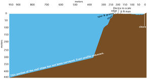 - On the lee side, the reef typically descends rather gently to a depth of about 12 meters, then becomes increasingly steep to about 40 meters, and then drops precipitously into the depths. Particularly off the northwest side of the island around Tatiman Passage there are arroyo-like features three or four meters deep and a meter or two wide, which the divers thought could easily catch and hold aircraft parts falling down from the reef flat, though none were noted. A shelf was noted at about 10-12 meters deep along the lee side, extending for some distance to the northwest from the vicinity of the Norwich City wreck. On the windward side the pitch of the reef is somewhat less precipitous and the reef is cut by "spur and groove" features--high energy channels radiating out from the island, generally quite straight, and one to two meters wide. The windward side also features a number of crater-like features that trap sand and could easily trap airplane wreckage were there any to be trapped. The reef on this side is also undercut at some points.