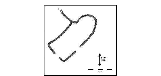 Structure 9 (Figure 12) is another rectilinear structure, 21 meters long and 7 meters wide, oriented northwest-southeast, with the usual stone walls. Its southeast end is curved, and there is a short cross-wall that segments the southeast end from the rest of the structure. The north wall, if it ever existed, is mostly gone, but for a single tier of stones forming an indeterminate pattern on the rubble ground. A ferrous wheel lay on one of the walls, and a heavy braided steel cable was found inside the southeast end room.