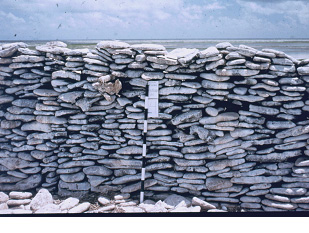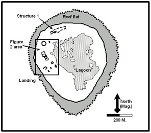 The ruins of ten dry-laid coral stone structures were recorded (Figures M-1, M-2). These ruins have been noted by virtually every previous 20th century visitor to the island, and are certainly the remains of the guano mining operation. Typically, these structures are of dry-laid stacked coral slabs, interspersed with standing slabs and boulders. Similar structures have been described on Manra (Sydney Island), where they apparently were built by workers in John Arundel's guano operations around the turn of the century.