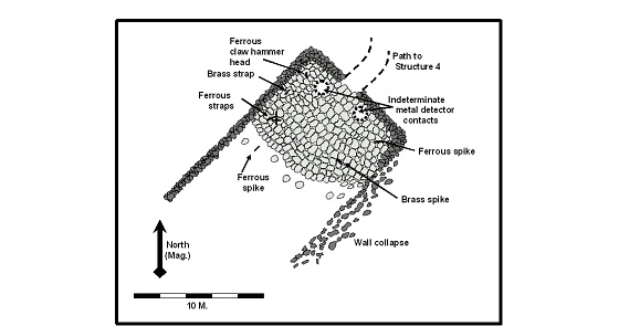 Structure 5 (Figure 9), connected to Structure 4 by a fairly straight pathway through the coral rubble, is a straightforward rectilinear structure with an open end facing southwest toward the landing and a smaller opening in the northeast wall. About 20 meters long and 12.5 meters. wide, Structure 5 has walls over 2.5 meters high. The northeast end of the ruin appears to have been floored with a pavement of coral cobbles. Ferrous spikes, straps, a claw hammer head, a chain link, and a brass spike and strap were found in metal detector sweeps, along with hits that could not be identified. Structure 5 appears to have been a warehouse or storage facility of some kind associated with the landing, readily accessible from Structure 4.