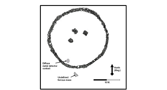 Structure 3 (Figure 6) is a rather impressive circular wall about 120 cm. high, 35 to 50 cm. wide, and about 22 meters in diameter. The wall is for the most part made up of stacked coral slabs, occasionally interspersed with large coral boulders or standing slabs. Three piles of coral are semi-symmetrically organized inside the circle, near its center. Metal detecting revealed an undefined lump of ferrous metal just outside the southeast arc of the circle, and a "hit" that could not be located on the inside of the circle nearby. Structure 3 may represent a guano drying facility.