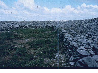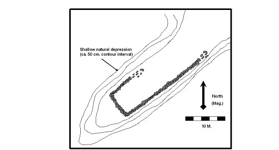Structure 1(Figure 3) is a low, "J" shaped wall about 80 cm. high and 50 cm. wide, in the linear depression along the north shore. A 6-meter long wall segment crosses the depression near its southwest end. A short segment to the north and a long (ca. 20 meters) segment to the south extend along the sides of the gully to the northeast.