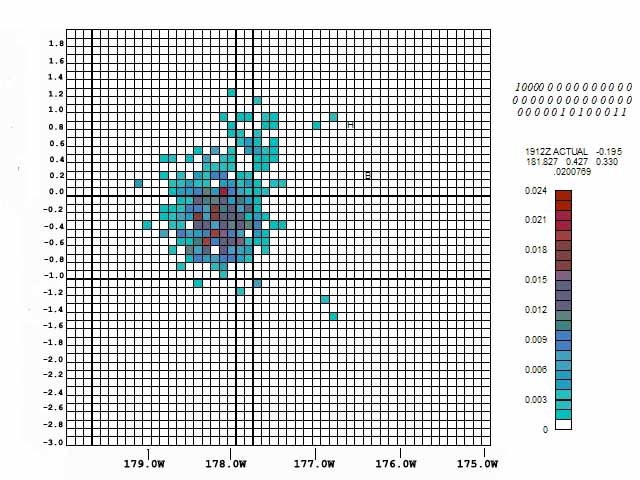 This is a plot of what the Monte Carlo runs predicts for the probability distribution for what is believed Earhart was located at 1912Z: