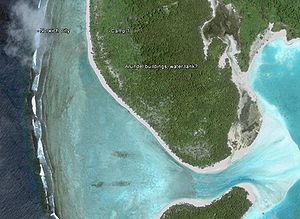 - "Near the palms we found two disused galvanised roofed huts and a large water tank, all of which were in a state of collapse, but which indicated to us that the island had at one time been inhabited, most probably with a view of growing coconuts, but that this had not proved to be very profitable and had been abandoned."