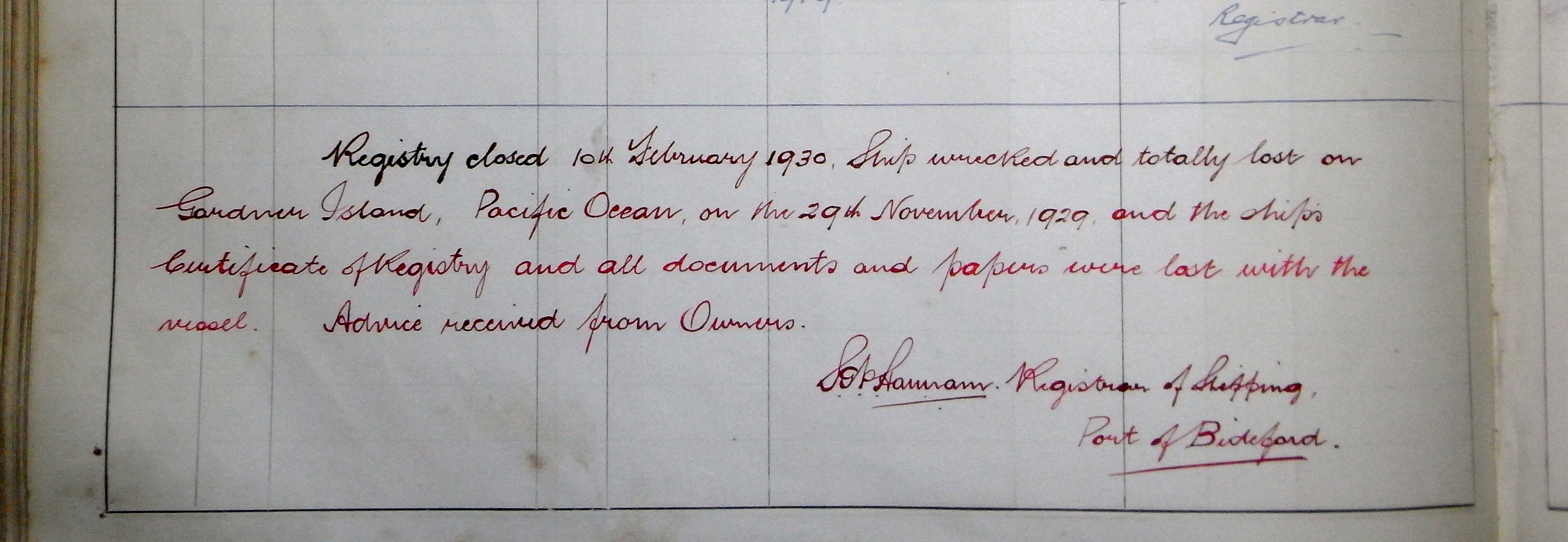 Last Entry in Norwich City's Registry Document in Bideford, UK (TIGHAR Collection)