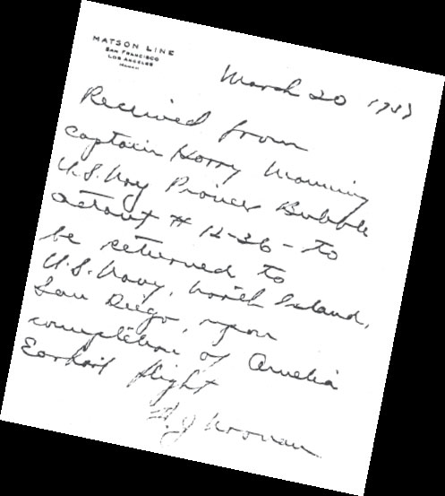 Harry Manning's receipt from Fred Noonan for U.S. Navy Pioneer Octant number 12-36 dated March 20, 1937, the date of the Luke Field take-off accident, and written Matson Line note paper. Noonan was to return the octant Manning signed for from the Navy upon completion of the Earhart flight. (TIGHAR Archives)