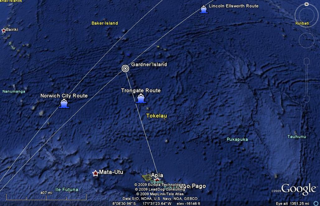 Approximate intended routes of the Norwich City, Lincoln Ellsworth and Trongate. The Trongate and the Lincoln Ellsworth rendezvoused at Gardner Island on Tuesday, December 3, 1929 to rescue the Norwich City survivors.