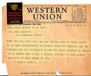 Harry Manning had just received a temporary assignment as Captain of United States Lines’ SS President Roosevelt when he met Amelia Earhart. It was his first command of a ship, and at age 31, he was the youngest Captain of a luxury liner on the seas. At a youthful appearing 5 ft 7 ½ inches and 130 pounds, he was chided as being “the boy Skipper.”[1] It was June of 1928. The crew of the Friendship, Captain Wilmer L. Stultz, pilot, Louis “Slim” Gordon, mechanic, and Earhart, boarded the Roosevelt in Southampton, England. They were returning to New York following a tumultuous welcome and a week of congratulatory activities as celebrities following their historic transatlantic flight. Captain Manning had sheltered Earhart from throngs of admiring onlookers by giving her refuge on the Roosevelt’s bridge deck and the two established an enduring friendship through their shared interest in flying. Just six months her senior, Manning, like Earhart, neither drank nor smoked and they established a mutual bond through their common interests and shared values. In a letter describing his first trip as a Captain, Manning wrote: “a glorious experience, ending as it did by bringing the Friendship flyers back. I have become quite intimate with the “girl” flyer. I am trying to convince her to fly the Friendship back again with me—but she won’t be convinced.”[2]