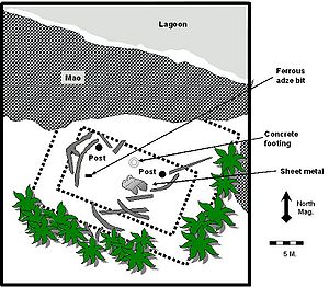 Nevertheless, we set out to make as detailed an inspection as we could. Immediately upon coming ashore, and beginning to work our way across from the landing site to the lagoon, we began to encounter traces of the colonial village--a standing structure with a sign identifying it as the "Gardner Co-Op Store, 1940" just inland from the landing, and a scatter of artifacts and structural remains extending most of the way to the lagoon shore. Reasoning that the last place to look for an unreported airplane would be in a known habitation site, we noted these items only in passing and made no plans for a systematic inspection of the village site.