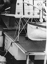 Commonly supplied equipment placed in lifeboats according to a maritime forum[8] were: hatchets with lanyards, mast and sails, compass, bailer, dipper (tube to insert into fresh water breaker or tank to extract a measured amount of water ration) tin opener (on jackknife), signaling equipment and flares, whistle, flashlight (torch), sea anchor, storm oil, spare bungs (plugs attached to keelson with chain for drain holes) oars, painter (rope to tie boat), rustproof water vessels (for drinking), biscuits, water in breakers or tanks, condensed milk, first aid kit, and fishing line & hooks.