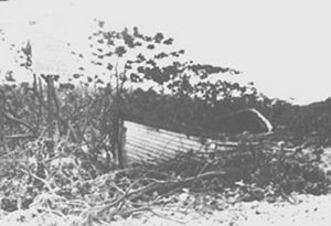 Sunday was a showery day, but with more sun than was wanted. The ponds of rainwater were quickly drying up, though a three week supply had been stored in the lifeboats’ tanks. In the morning an issue of water was given, and the camp was moved. Parties were dispatched to look for water and coconuts and the remainder worked on building a camp shelter. Upon return of the parties, rations were issued: biscuit, meat, diluted milk, and “coconut for dessert”.