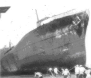 - Lt. John Lambrecht’s Report on the Search of the Phoenix Islands: ”At the western end of the island a tramp steamer (of about 4000 tons) bore mute evidence of unlighted and poorly charted “Rocks and Shoals”. She lay high and almost dry head onto the coral beach with her back broken in two places.”