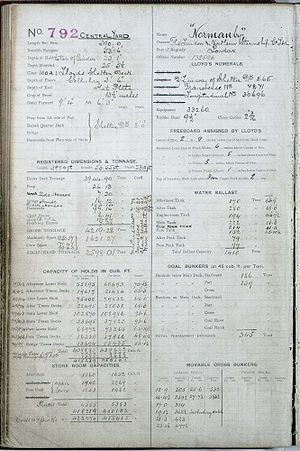 The Norwich City was launched as the Normanby on 12 July 1911, by William Gray and Company of West Hartlepool with the assigned yard number of 792 (similar to a constructor's number). Originally built for the London and Northern Steamship Company, she was registered out of London as ship number 132596. The 397 foot bulk carrier had a beam of 53 feet 5.5 inches. The keel had been laid five months earlier on 9 February 1911, and was constructed of steel. She was driven by a Central Marine 412 BHP (1960 IHP) triple expansion reciprocating steam engine whose three cylinders of 70, 40, and 26 inches propelled the ship at an operating speed of 9 knots. Fitted with two multitubular steel boilers, steam was produced at 180 psi. The steering gear and windlass machinery were also operated by steam. At launching, the gross tonnage was calculated to be 5633.2; her displacement was 8730 tons.