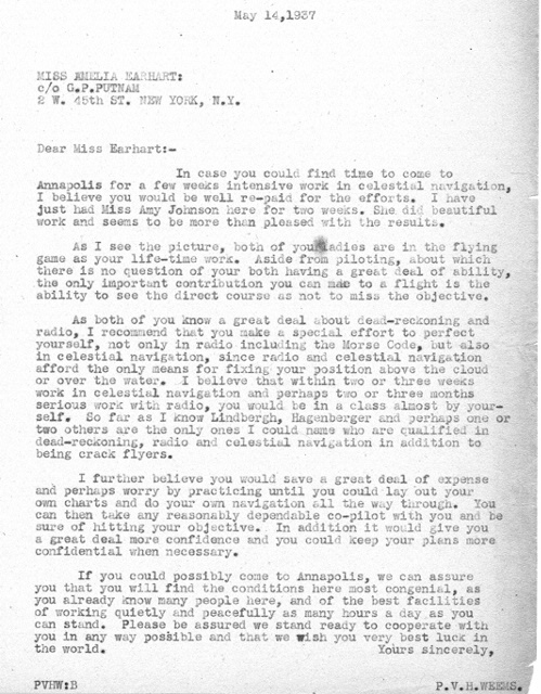 | 17:16, 16 February 2013 | Weems to Earhart Letter Courtesy National Air and Space Museum.jpg (file) | 151 KB | Rickerjones | Commander PVH Weems offered to provide Earhart with celestial navigational and radio skills, including Morse code, which he felt was necessary for overwater flight. His May 14, 1937 letter was 5 days before Earhart’s Oakland departure on the second ... | 1 | |