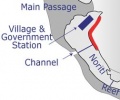 There are really (at least) three or four "village" areas. The Government Station is up in the tip of the dog-nose pointing into the lagoon along the south shore of Tatiman Passage. There's the old village, which actually moved and morphed but was basically peripheral to the Government Station, north of the blasted channel. There's the Gallagher Highway area, running between the blasted channel and the lagoon, where there were a number of later government and other facilities (e.g. the school), and there's the "new village" or "Laxton-era" village that began south of the Government Station and extended down for some distance across and south from the Gallagher Highway area, along a N-S tending road, to the maneaba on the lagoon shore well southeast of the blasted channel.